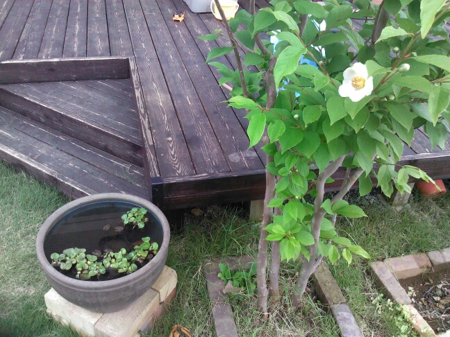 下の睡蓮鉢は、今の私の癒し、メダカのためのビオトープもどきです。