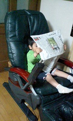 マッサージチェアで新聞。